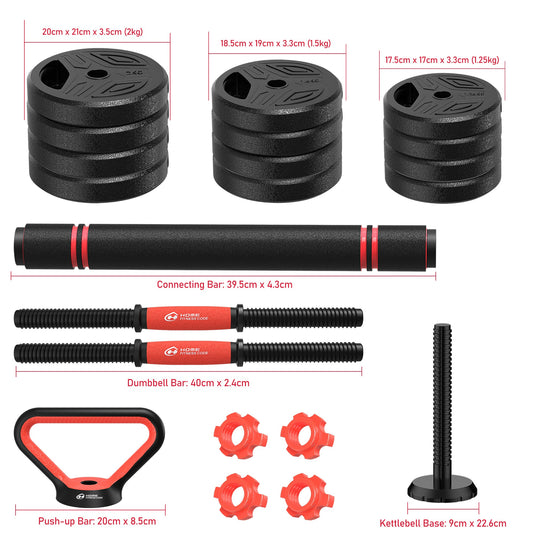 Viktplattor Storlek: 17,5cm x 17cm x 3,3cm (1,25 kg); 18,5cm x 19cm x 3,3cm (1,5 kg); 20cm x 21cm x 3,5cm (2 kg) - Paketet innehåller: 2KG viktplatta x4; 1,5KG viktplatta x4; 1,25KG viktplatta x4; hantelstång x2; anslutningsstång x1; armhävningsstång x2; kettlebellbas x1; viktmutter x4