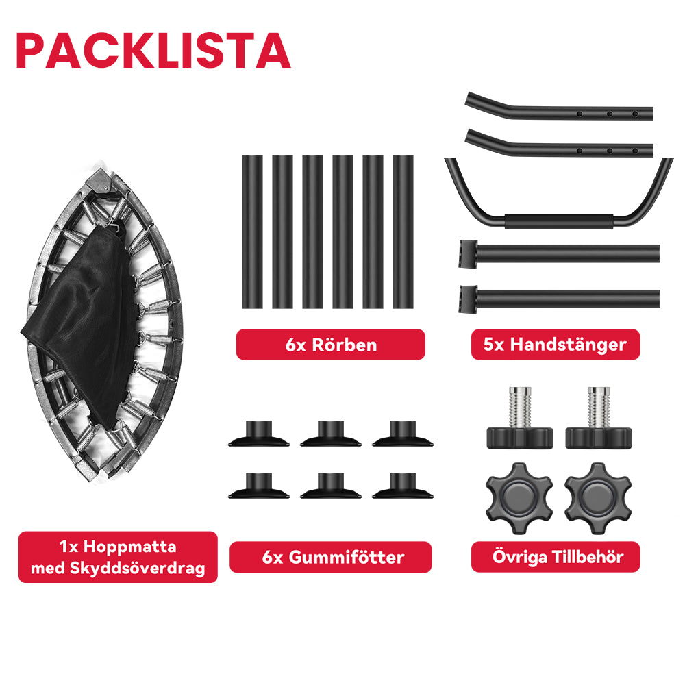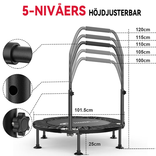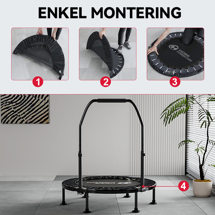Fitnesstrampolinen kan vikas två gånger, vilket minskar storleken till 1/4, vilket gör den enkel att bära och förvara.