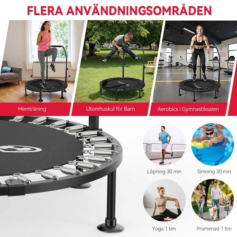 10 minuters hoppning på trampolin motsvarar 20 minuters simning, 30 minuters cykling och 60 minuters jogging, vilket ger liknande kardiovaskulära fördelar samtidigt som det är skonsammare för lederna.
