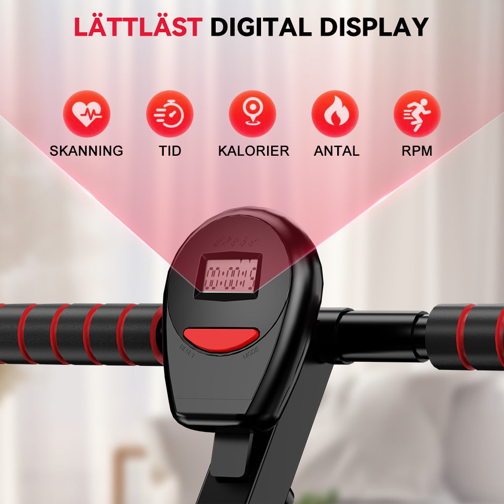 - Digital display: Skanning, Tid, Kalorier, Antal, RPM