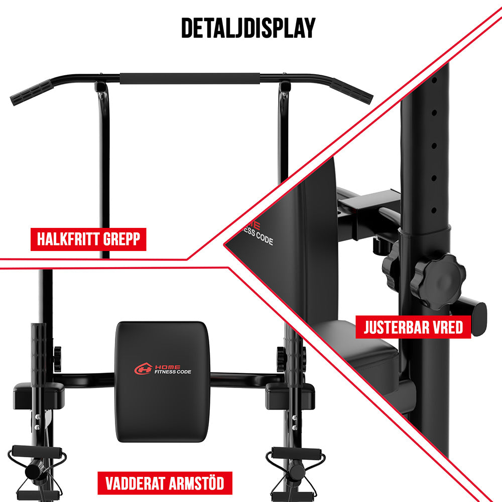 Utformad med en pull-up-stång, push-up-stång och dip-stång kan den hjälpa dig med ben- och knälyft, pull-ups, push-ups, repdragningsövningar och mycket mer.
