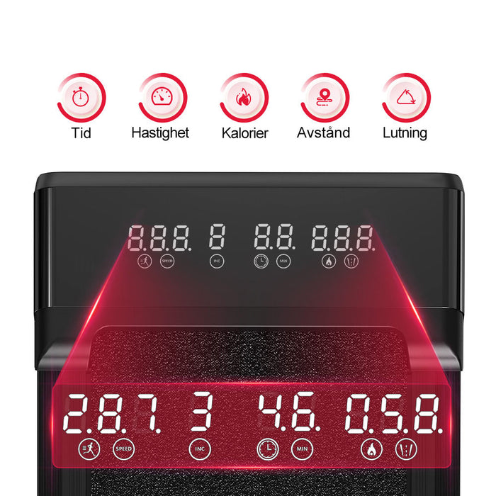 Stor LED-display ger tydlig träningsinformation som tid, hastighet, förbrända kalorier, distans och lutning.